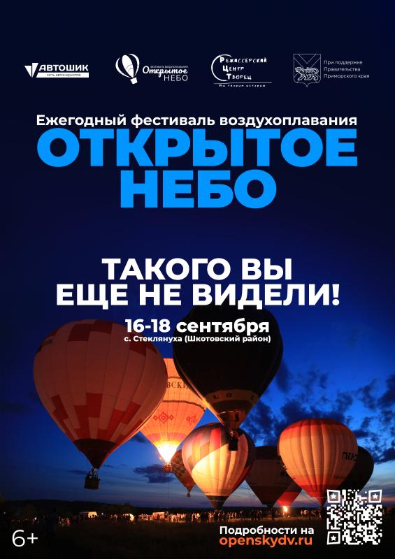 Первый фестиваль воздухоплавания «Открытое Небо» (6+) пройдет с 16 по 18 сентября в Приморском крае. Гости мероприятия смогут подняться в небо на воздушном шаре, покататься на легкомоторных самолетах, потанцевать под песни известного московского артиста и заняться множеством других активностей. Организаторами Фестиваля выступает Режиссерский центр «Творец» и «Новое Радио» при поддержке правительства Приморского края.
