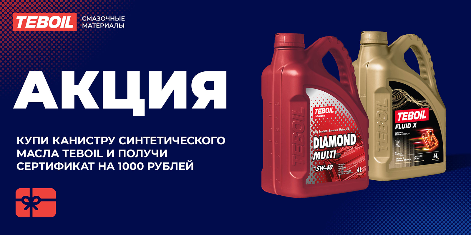 Купи канистру синтетического моторного или трансмиссионного масла TEBOIL и получи сертификат на 1000 рублей в подарок*